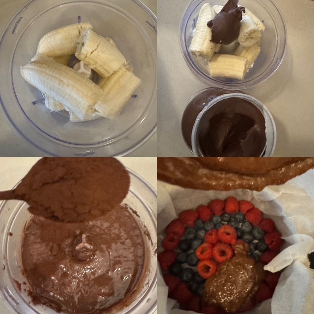 | Ingredienti per 8 persone: 4 banane versione 1 – due cucchiai da te di Nutella versione due – 1 tavoletta di cacao fondente al 75% da 300 gr2 cucchiai di cacao amaro in polvere frutti rossi a piacere |